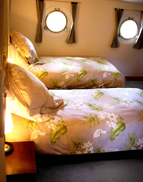 | Cabin | Thanks to the design on two levels, Enchante boasts the most spacious cabins on the Canal du Midi. Each of the 4 staterooms covers a similar size of 16 sq meters, all with an ensuite shower-room (hairdryer and complimentary amenities). Available in twin split or queen size bed option. Individually air-conditioned/heated, writing desks, bedside tables and wardrobes |